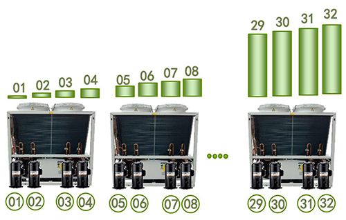 多級(jí)容量調(diào)節(jié):機(jī)組每個(gè)模塊采用多個(gè)獨(dú) 立冷媒回路設(shè)計(jì),單機(jī)最大可實(shí)現(xiàn)0-25%-50%-75%-100%的多級(jí)容量調(diào)節(jié)。