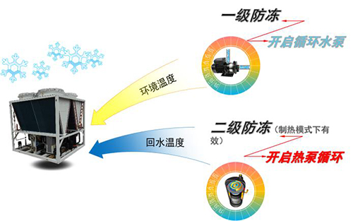 防凍保護:待機時智能運行防凍保護,當主機檢測到水路系統水溫過低時,首先自動開啟循環水泵以防局部水溫偏低而凍結,一級防凍執行后仍探測到水溫偏低時,自動啟動二級保護,啟動壓縮機并執行低水溫加熱循環以防止水溫偏低而凍結。